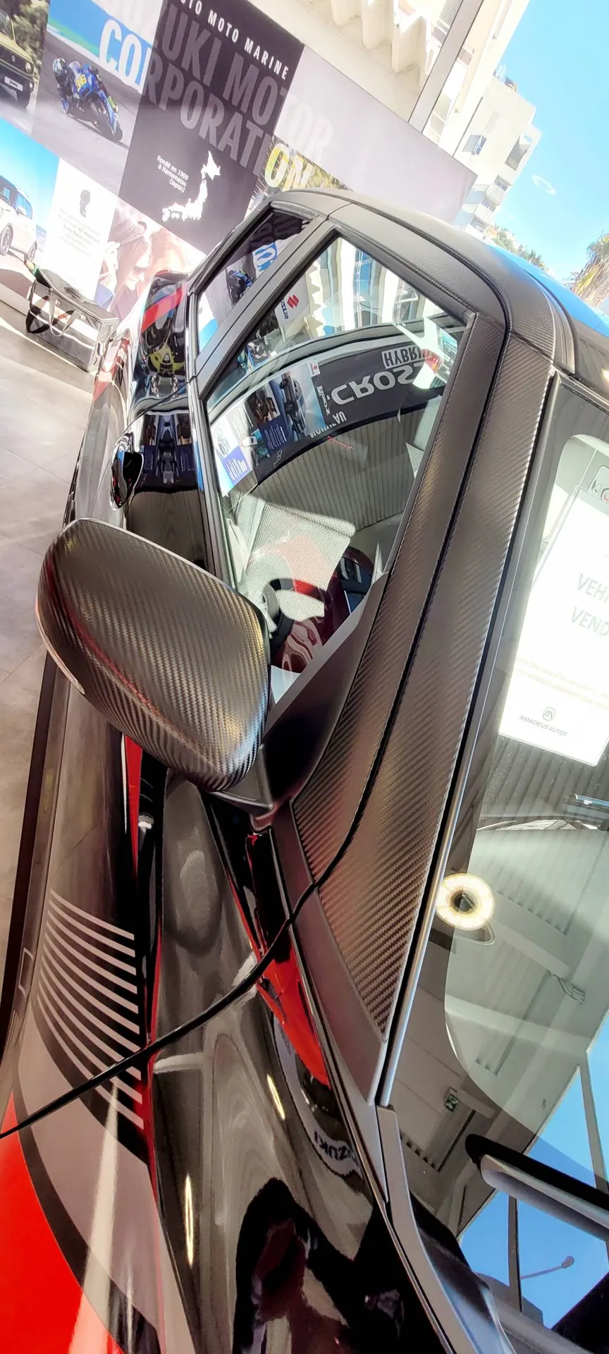 Sur ce véhicule neuf prêt pour sa livraison client, nous lui avons apporté une belle touche de sportivité en lui posant un kit déco avec des petites notations de rouge et un pack carbon.