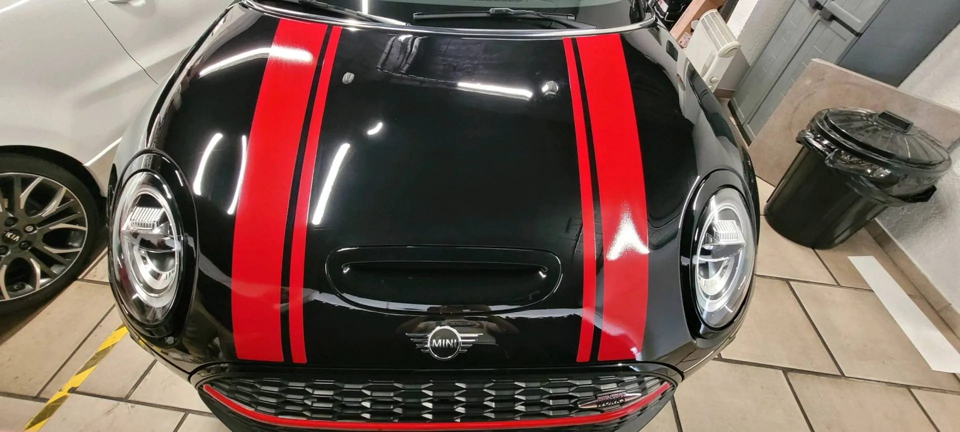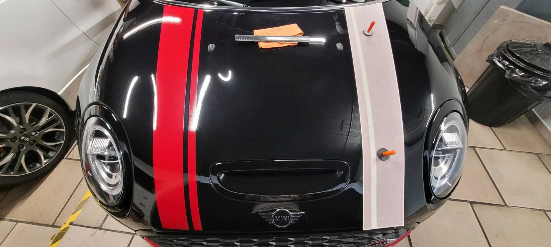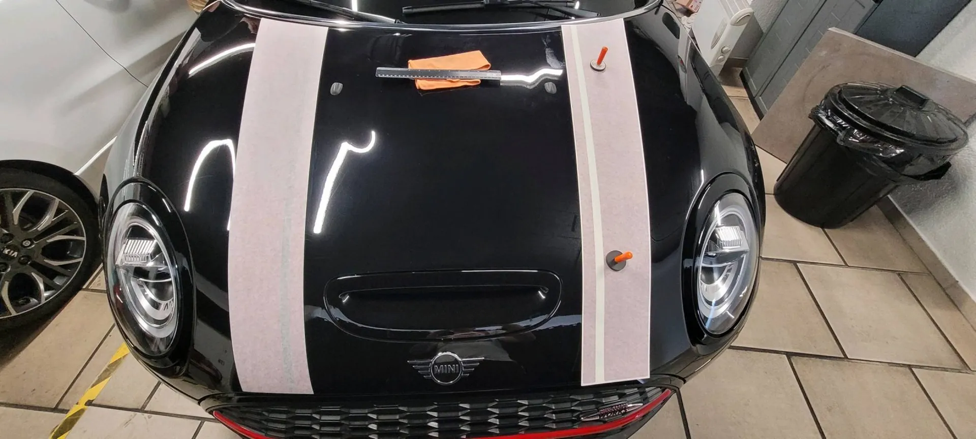 Sur cette mini clubman, notre cliente nous a demandée la pose du kit deco *Cooper works*.... effet garanti.